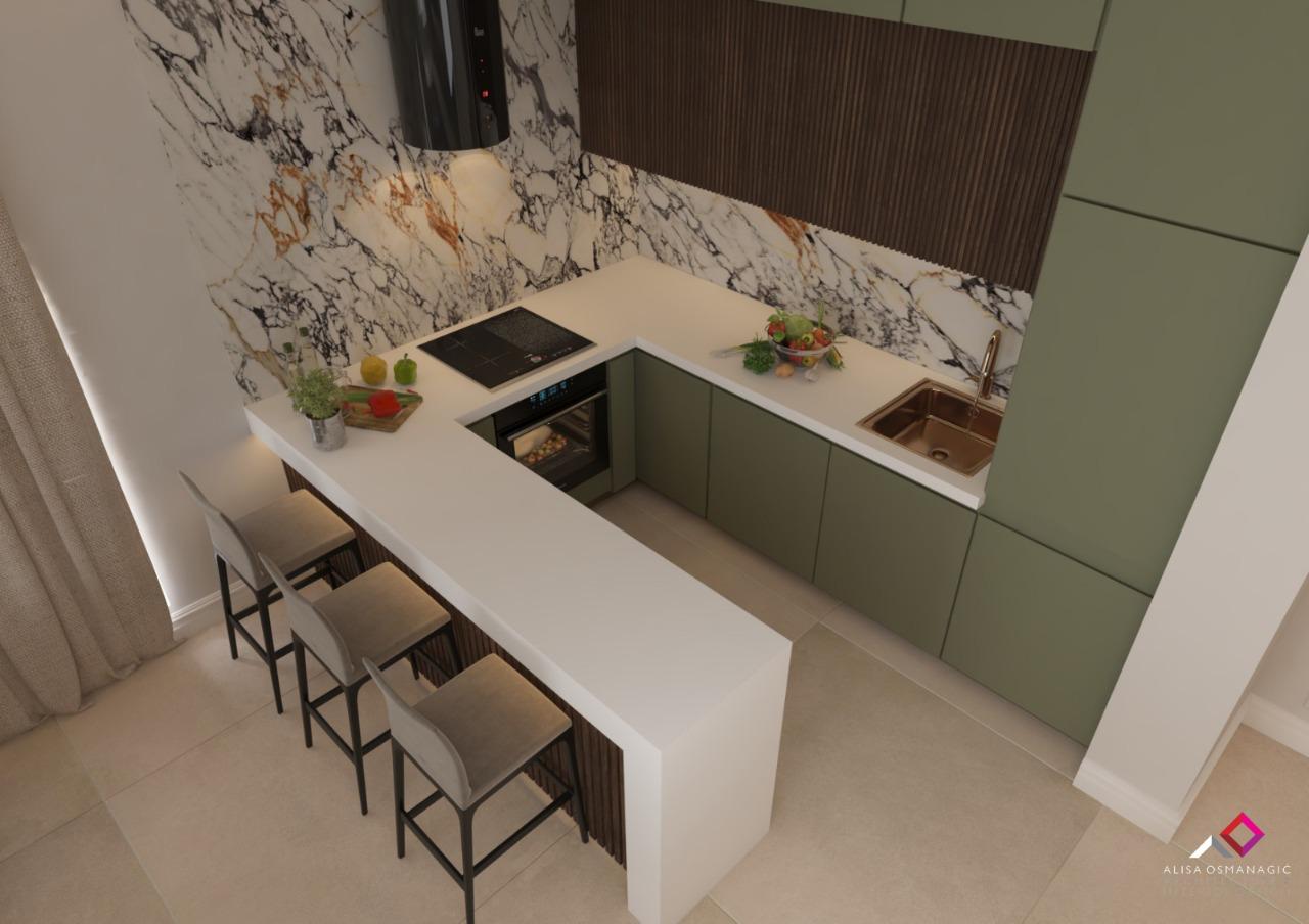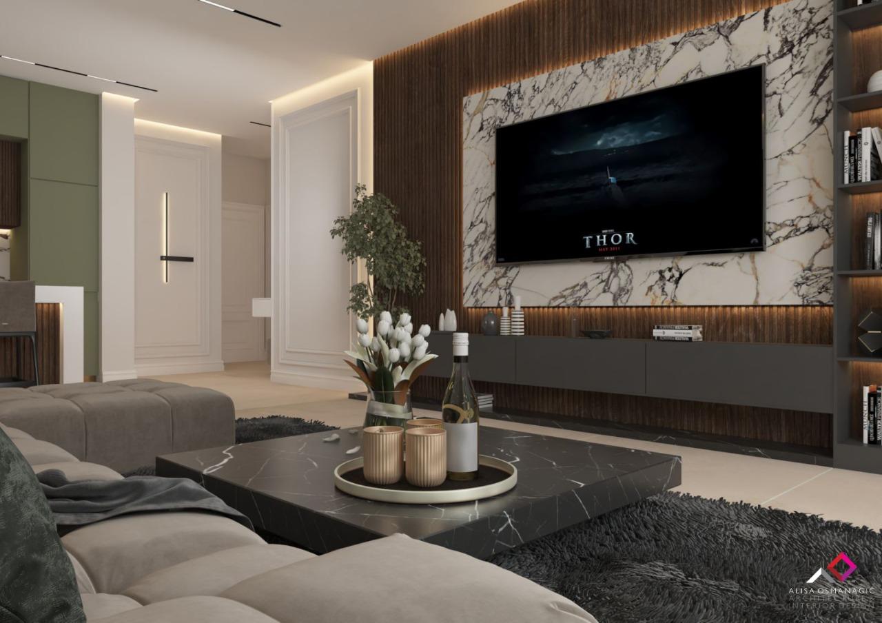Sastoji se iz predsoblja, velikog dnevnog boravka sa kuhunjom i trpezarijom, gostinskog toaleta, dvije spavaće sobe , kupatila, vešernice i velike terase sa koje se pruža fenomenalan pogled na more.
